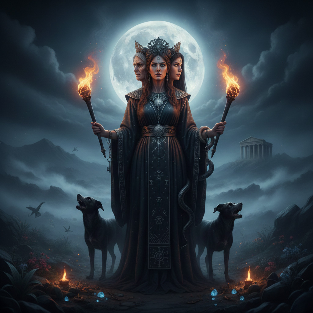 La raffigurazione più interessante di Ecate è nella figura triadica in relazione alla Luna e, in particolare, al ciclo delle sue fasi (nascente, crescente e calante), oppure, similmente, nella sua rappresentazione antropomorfa come fanciulla, donna e vecchia. Sempre legata al concetto di metamorfosi o trasformazione, che sia riguardo al trascorrere del tempo, al compiersi di un percorso circolare e, in senso più lato, riguardi il ciclo della nascita che porta alla morte e viceversa, attraverso la rigenerazione e la resurrezione.